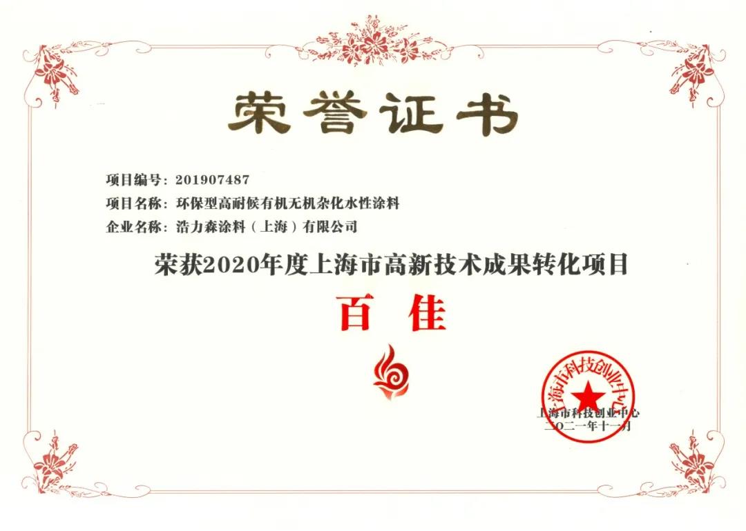 憑借“環(huán)保型高耐候有機(jī)無機(jī)雜化水性涂料”項(xiàng)目浩力森榮獲2020年度上海市高新技術(shù)成果轉(zhuǎn)化項(xiàng)目百佳。值得一提的是這已是浩力森第三次獲得該項(xiàng)榮譽(yù)。