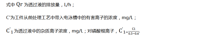 為了凈化電泳槽液,需要排放部分超濾液,以排除影響電泳槽液性能的有害雜質(zhì)離子,排放量按照下面方式參考計算:
