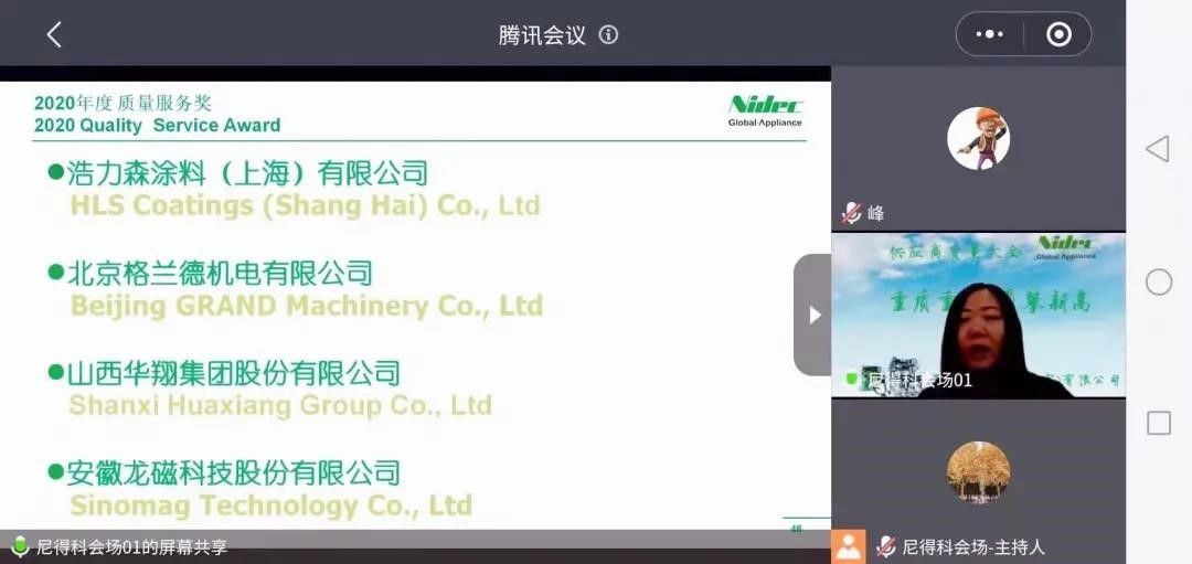 2021年1月,尼得科壓縮機(jī)(北京)有限公司舉行了"2020年度供應(yīng)商質(zhì)量大會(huì)",由于疫情影響,為了響應(yīng)國(guó)家號(hào)召,避免人員聚集,此次大會(huì)采用線上直播形式,全球各地的優(yōu)秀經(jīng)銷商代表、優(yōu)秀供應(yīng)商、以及其他相關(guān)部門工作人員等共同參與了此次直播。浩力森涂料榮獲了尼得科壓縮機(jī)“質(zhì)量服務(wù)獎(jiǎng)”,載譽(yù)而歸。