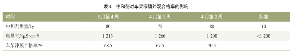 現(xiàn)場(chǎng)電泳槽液溶劑含量雖在工藝要求范圍內(nèi),但是整體偏低,提高溶劑含量可以明顯降低電泳漆膜外觀缺陷的發(fā)生率。2021年3月第4周一次性補(bǔ)加600kg溶劑,提高溶劑含量0.3%,漆膜外觀問(wèn)題明顯改善,車架漆膜合格率由40%提升至68%。