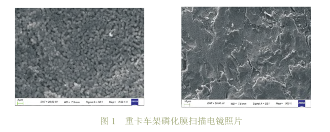 磷化膜的功能是提高涂覆在其上的電泳漆膜的附著力和耐蝕性,磷化膜結(jié)晶要求均勻致密,尺寸<8μm,進(jìn)一步分析磷化是否對(duì)電泳漆膜表面粗糙產(chǎn)生不良影響。采用車架縱梁沖孔邊角料在車架現(xiàn)場(chǎng)隨線制備了磷化膜,對(duì)磷化膜進(jìn)行掃描電鏡SEM分析。掃描電鏡圖片如圖1所示,發(fā)現(xiàn)磷化膜為粒狀,結(jié)晶均勻致密,結(jié)晶尺寸2~3μm,成膜質(zhì)量合格,均符合標(biāo)準(zhǔn)要求,未發(fā)生異常波動(dòng),故磷化膜質(zhì)量不是車架電泳漆膜粗糙的主要原因。