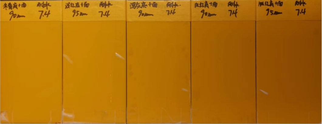 隨著產(chǎn)品的個(gè)性化發(fā)展,異色系底漆在工程機(jī)械上的應(yīng)用越來越廣泛,本文我們通過一系列試驗(yàn)驗(yàn)證異色系底漆不同顏色對(duì)配套面漆的影響,下面以配套工程黃色面漆為例,選擇淡黃、淡紅、深灰、玫紅、鐵紅5種不同顏色的底漆來進(jìn)行實(shí)驗(yàn)驗(yàn)證。 . 實(shí)驗(yàn)1:不同顏色底漆配套面漆光澤對(duì)比 實(shí)驗(yàn)?zāi)康模候?yàn)證面漆在不同顏色的底漆上光澤數(shù)據(jù)的差異 儀器:BYK三角度光澤儀 測(cè)試數(shù)據(jù): 實(shí)驗(yàn)結(jié)論:不同顏色底漆對(duì)于面漆光澤影響不大 實(shí)驗(yàn)2:不同顏色底漆配套面漆光澤對(duì)比 實(shí)驗(yàn)?zāi)康模候?yàn)證在不同顏色的底漆上面漆梯度膜厚的色差值 儀器:愛色麗 AM-94 測(cè)試數(shù)據(jù): 實(shí)驗(yàn)3:不同顏色底漆配套面漆機(jī)械性能對(duì)比 實(shí)驗(yàn)?zāi)康模候?yàn)證不同顏色的底漆對(duì)面漆機(jī)械性能的影響 測(cè)試數(shù)據(jù): 測(cè)試照片: 實(shí)驗(yàn)4:不同顏色底漆配套面漆耐水性能對(duì)比 實(shí)驗(yàn)?zāi)康模候?yàn)證不同顏色的底漆對(duì)面漆耐水性能的影響 測(cè)試數(shù)據(jù):23℃耐水性測(cè)試480小時(shí)無起泡、無生銹 測(cè)試照片: 實(shí)驗(yàn)結(jié)論:不同顏色底漆對(duì)于配套面漆耐水性能無影響 實(shí)驗(yàn)?zāi)康模候?yàn)證不同顏色的底漆對(duì)面漆耐濕熱性能的影響 測(cè)試數(shù)據(jù):耐濕熱性測(cè)試480小時(shí)板面無起泡、不生銹、不開裂 測(cè)試照片: 實(shí)驗(yàn)結(jié)論:不同顏色底漆對(duì)于配套面漆耐濕熱性能無影響 綜上所述: 1. 異色系底漆顏色越深,對(duì)面漆色差影響越大,面漆耗量越高,綜合成本也越高。底漆的顏色、涂料因厚度改變而產(chǎn)生的光澤改變等因素在涂料調(diào)色乃至涂裝過程中必須考慮充分。 2. 在實(shí)際生產(chǎn)過程中,選擇異色系底漆顏色越深,越容易造成工件R角、銳角、邊緣遮蓋不良等問題。 3. 底漆顏色對(duì)于配套板機(jī)械性能、耐性基本無影響。 .