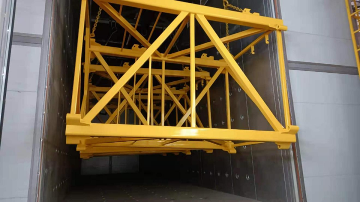 每次噴涂后設(shè)置閃干工序,確保大量揮發(fā)出來的水分能夠及時(shí)地排出,確保漆膜良好的外觀光澤;閃干工序之后設(shè)置烘干工序,完全干燥漆膜。一方面促進(jìn)水性底漆表干,減少底面漆“濕碰濕”之間的閃干時(shí)間,提高生產(chǎn)效率。采用熱風(fēng)對(duì)流循環(huán)對(duì)結(jié)構(gòu)件表面進(jìn)行加熱,為減少熱量交換的熱損失,采用效率相對(duì)較高的直燃式天然氣加熱方式。經(jīng)驗(yàn)證明前道工件表面溫度以(15-35) ℃為宜,過高的溫度會(huì)影響底/面漆的流平和固化反應(yīng),可能產(chǎn)生起泡、干噴等缺陷,同時(shí)浪費(fèi)烘烤能源。
