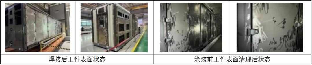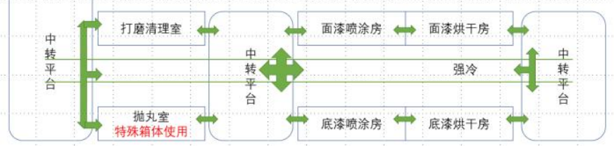 1. 碳鋼厚板件:自動拋丸→清理→富鋅漆自動噴涂(8-15μm 做短期防銹)→烘烤(設(shè)定 80℃) →冷卻→下件; (與集裝箱前處理工藝及性質(zhì)相同)